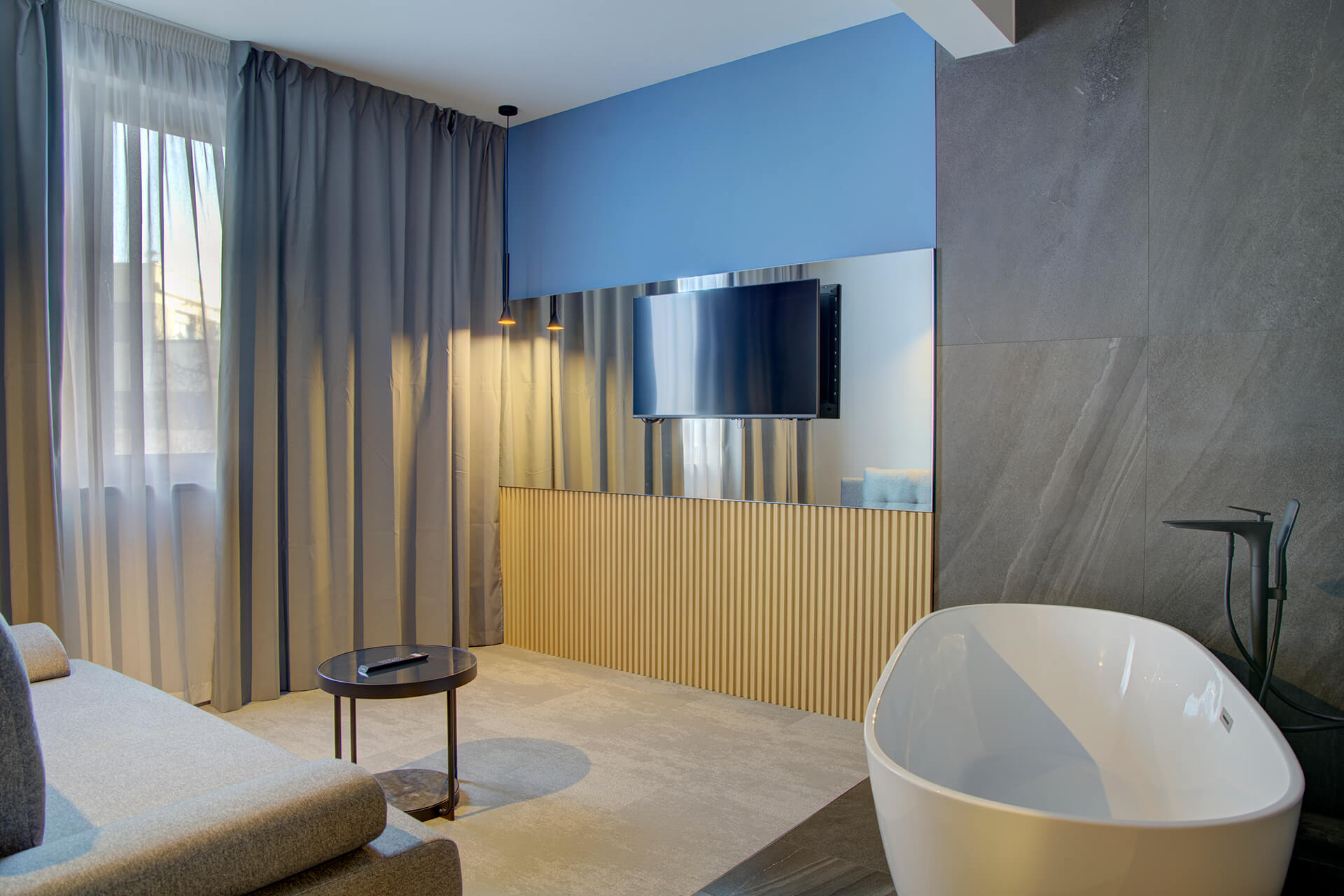 In addition to a spacious, modern and elegant bathroom, equipped with underfloor heating and all the necessary cosmetic accessories, this room comes with an additional bathtub in the open area of the living room. Staying in this unit will certainly raise comfort to a whole new and unforgettable level.
